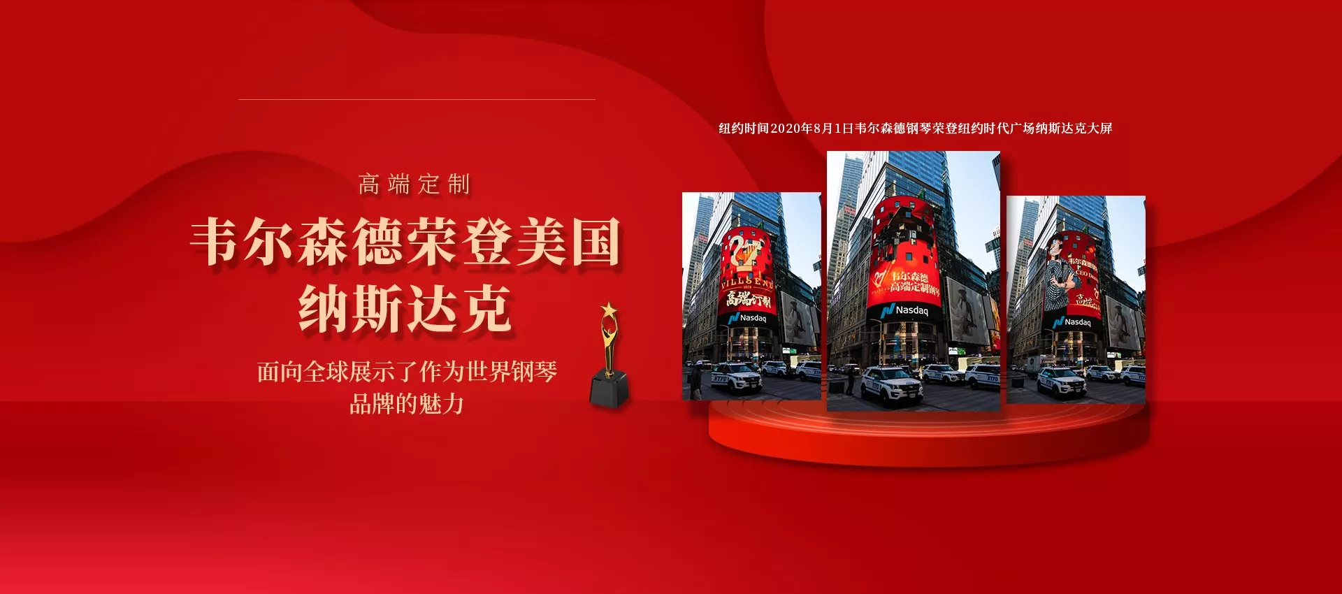纽约时间2020年8月1日韦尔森德钢琴与诸多著名品牌一同亮相纽约时代广场纳斯达克大屏。
